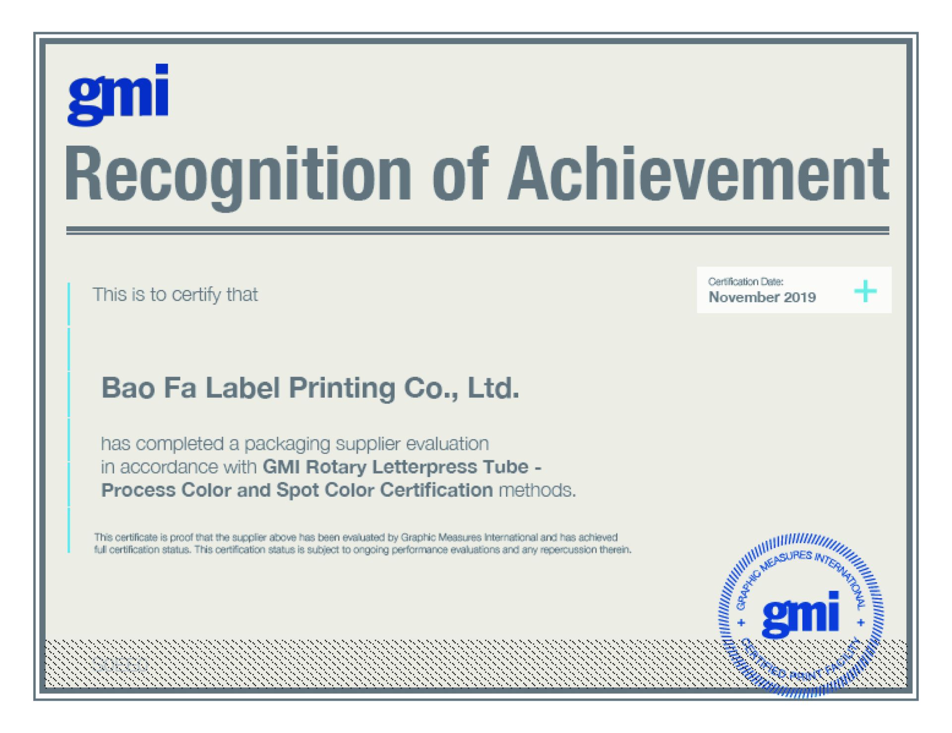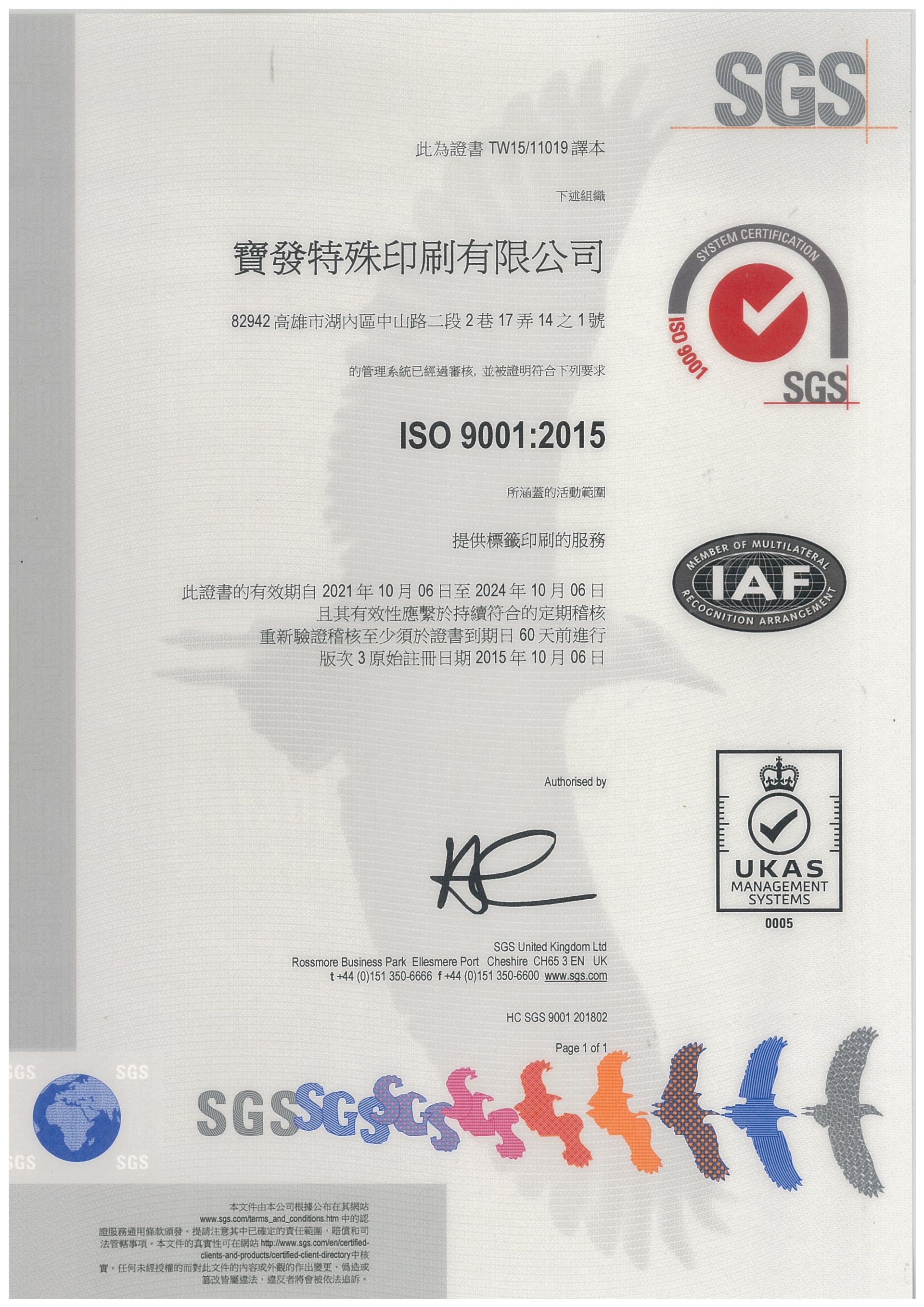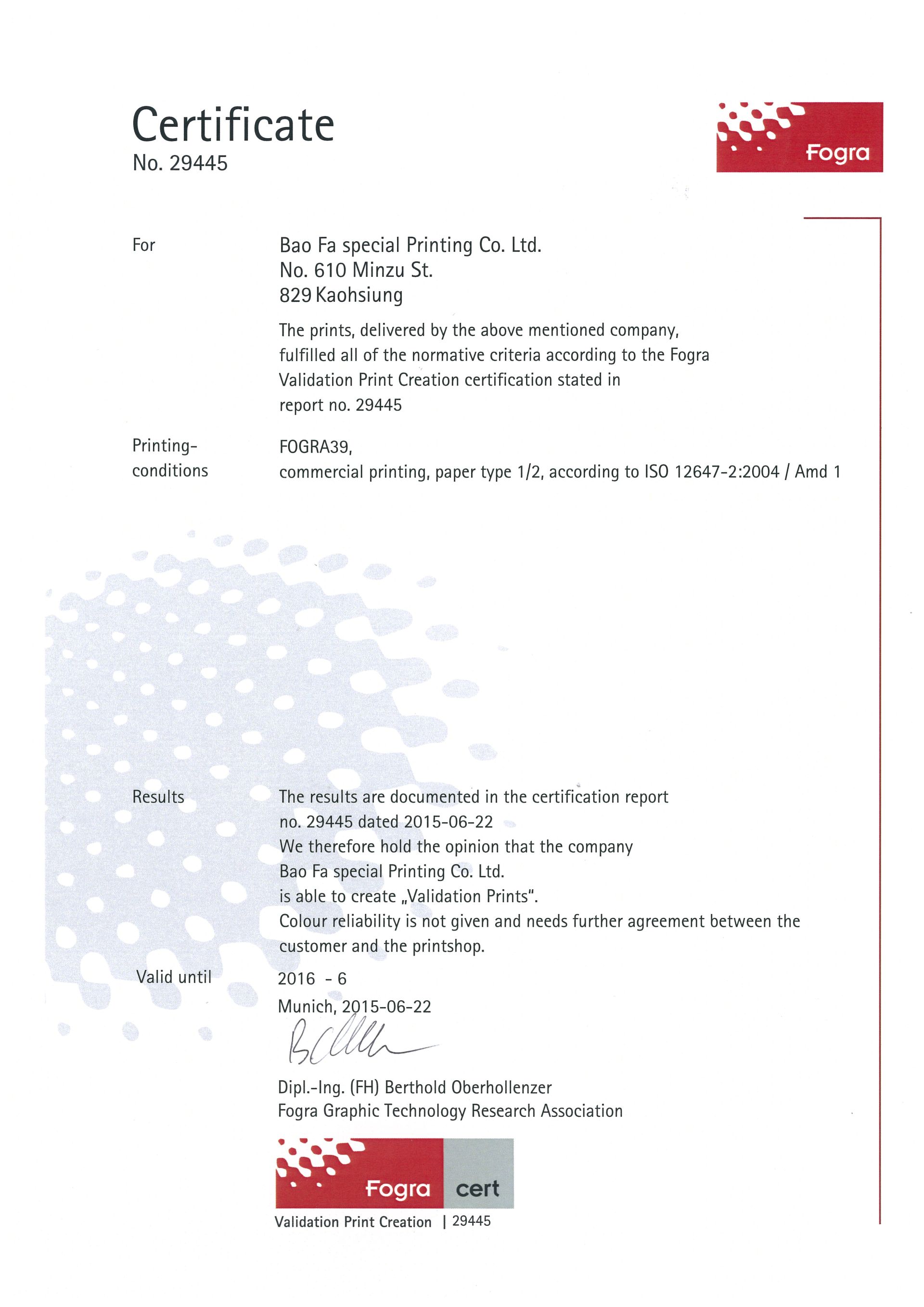 寶發全面落實色彩數據化管理,支援客戶產品獨特價值的定位策略,也因為對色彩 美學的堅持,繼IS09001:2000品質管理系統認證之後,更順利於2015年獲得德國 Fogra色彩認證,與國際色彩水準齊平。